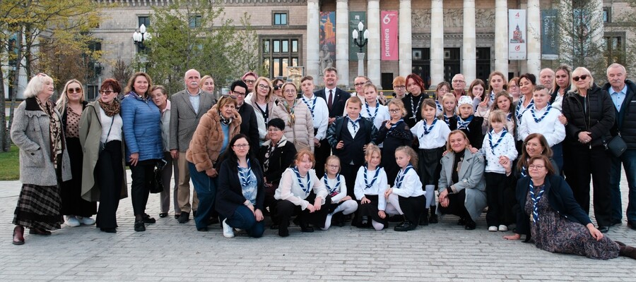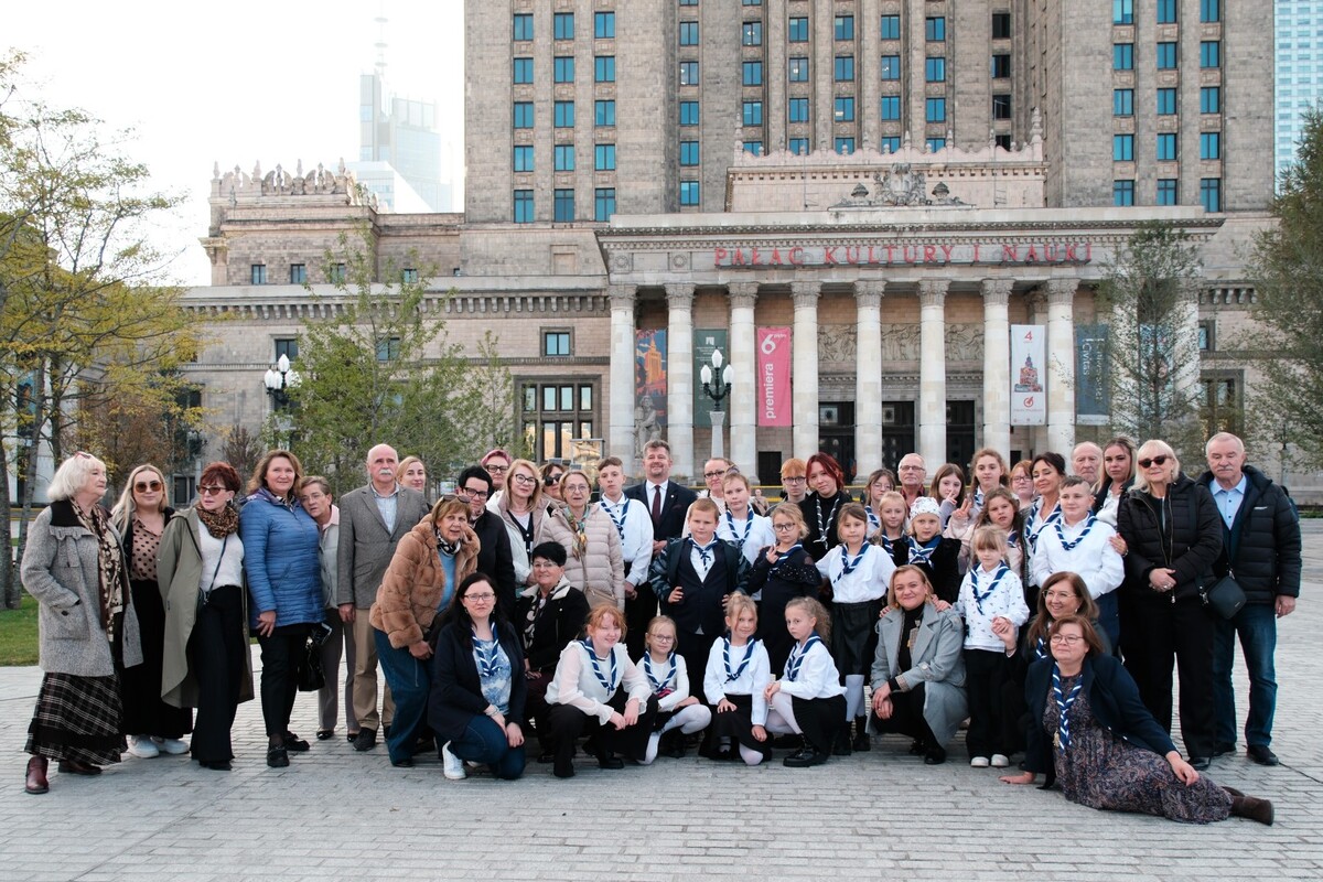 Wizyta w Warszawie zakończyła się wspólnym pamiątkowym zdjęciem uczestników pod Pałacem Kultury i Nauki.