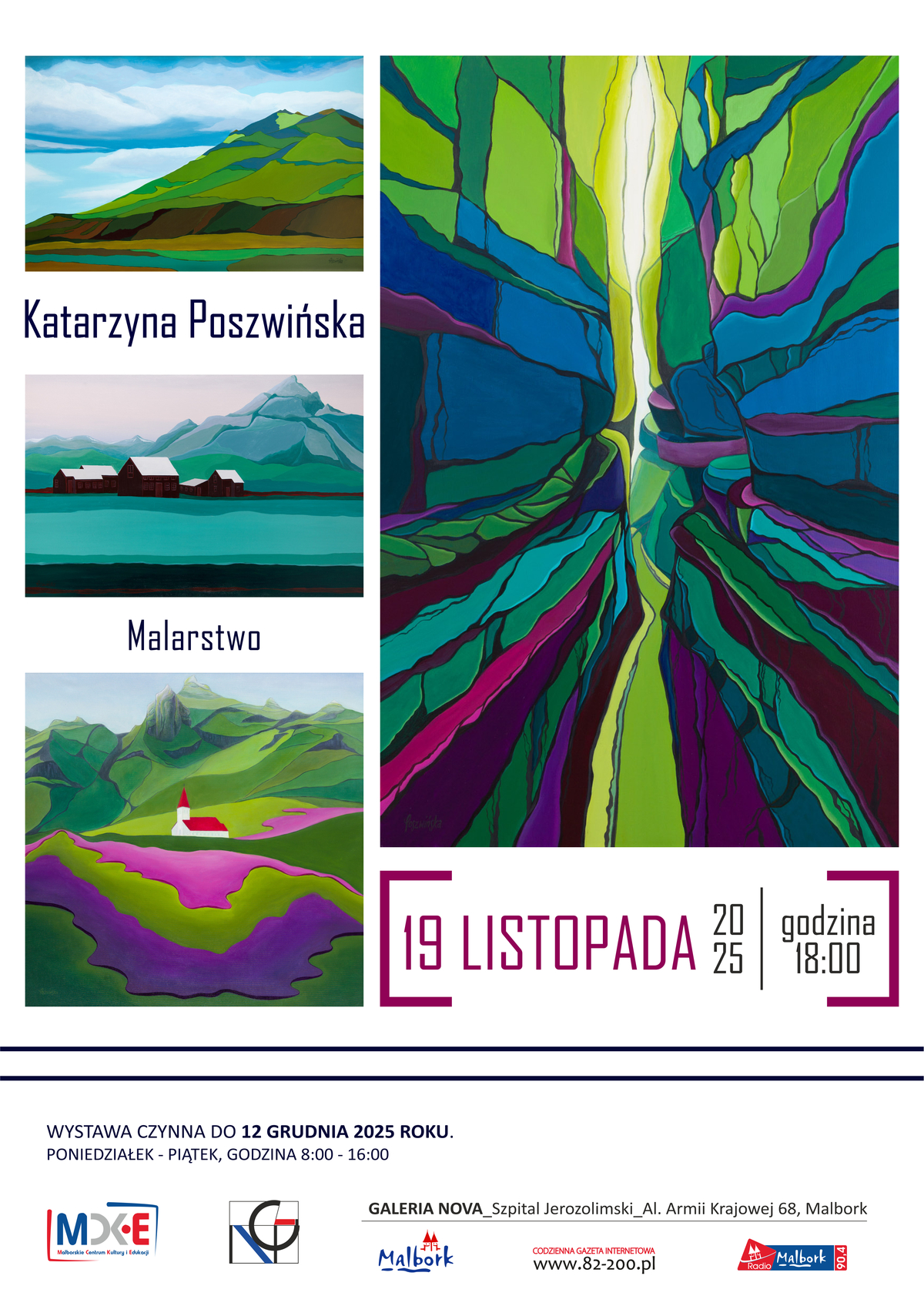 Malborskie Centrum Kultury i Edukacji oraz Galeria NOVA zapraszają na wernisaż wystawy malarstwa Katarzyny Poszwińskiej, który odbędzie się 19 listopada 2025 r. (środa) o godz. 18:00 w siedzibie MCKiE przy ul. Armii Krajowej 68 w Malborku.