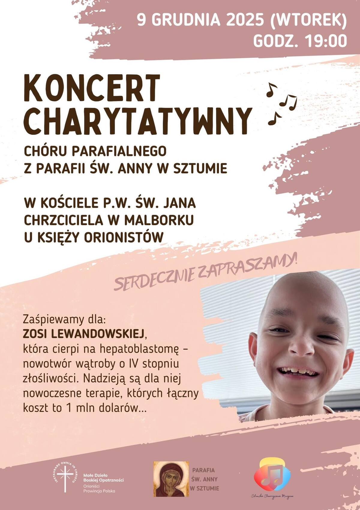 Chór parafialny z Parafii św. Anny w Sztumie zaśpiewa, by wesprzeć Zosię Lewandowską, zmagającą się z agresywnym nowotworem wątroby – hepatoblastomą w IV stopniu złośliwości. Dla dziewczynki nadzieją są kosztowne terapie, których łączna cena sięga miliona dolarów, dlatego całkowity dochód z wydarzenia zostanie przeznaczony na jej leczenie. Zachęcamy do udziału.