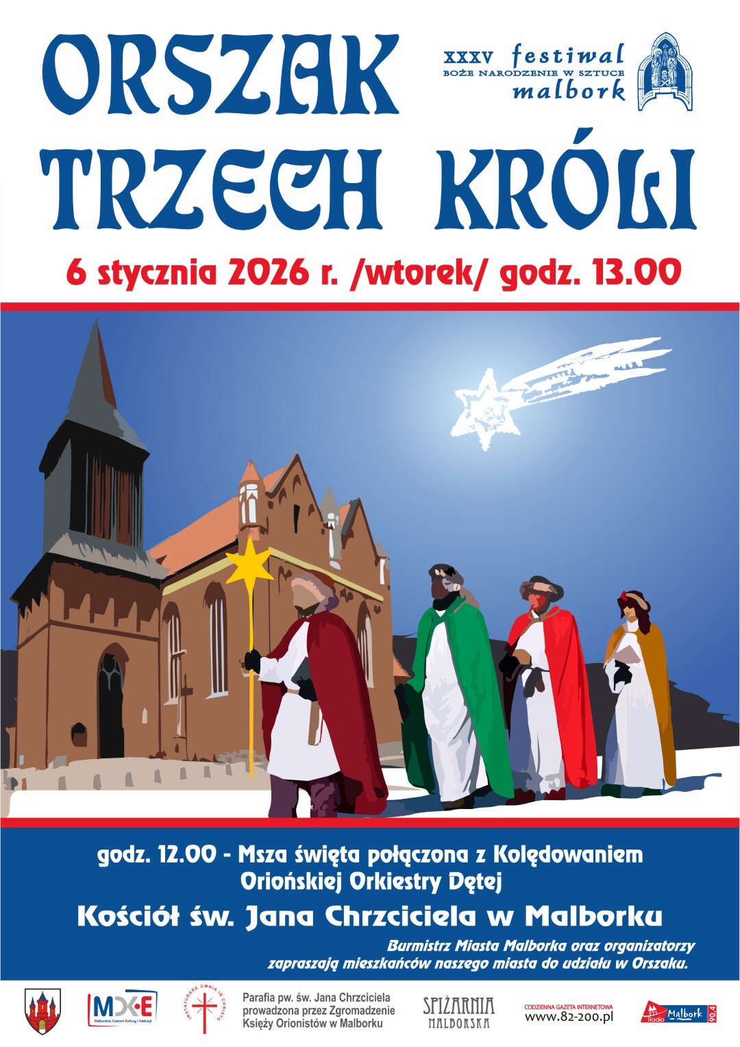 6 stycznia 2026 roku w Malborku odbędą się uroczyste obchody Święta Trzech Króli, organizowane w ramach XXXV Festiwalu „Boże Narodzenie w Sztuce”. Do wspólnego świętowania mieszkańców oraz gości zapraszają Burmistrz Miasta Malborka, Malborskie Centrum Kultury i Edukacji, Spiżarnia Malborska oraz Parafia św. Jana Chrzciciela w Malborku.