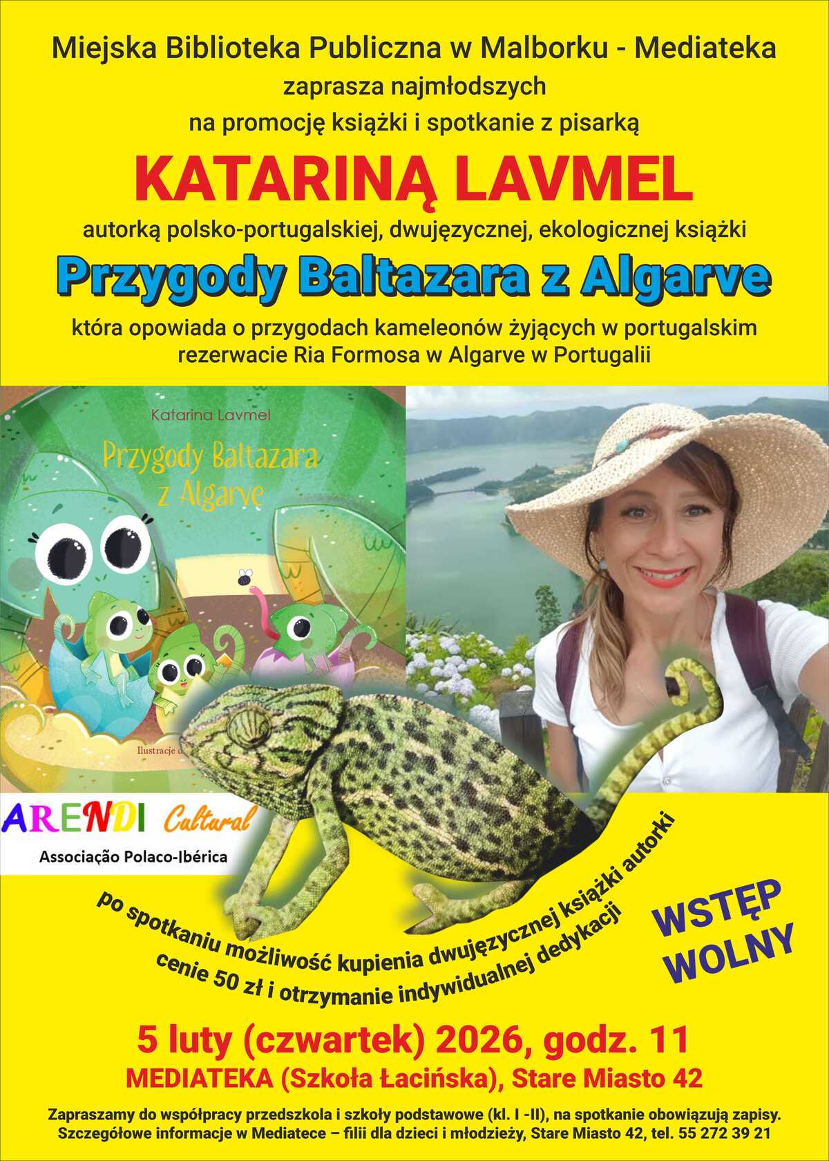 Miejska Biblioteka Publiczna w Malborku zaprasza najmłodszych czytelników na wyjątkowe spotkanie literackie i spotkanie z książką pt. Przygody Baltazara z Algarve opowiadającą o przygodach kameleonów żyjących w rezerwacie Ria Formosa.