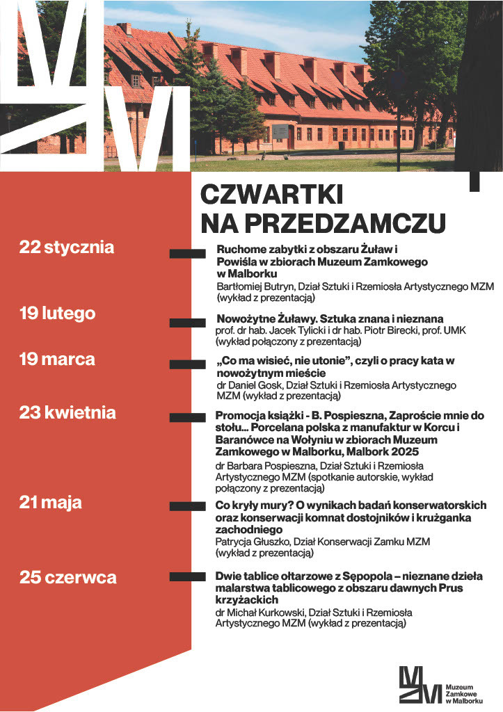 Muzeum Zamkowe w Malborku w Nowym Roku wraca z „Czwartkami na Przedzamczu”. Pierwsze spotkanie odbędzie się 22 stycznia o godz. 17.00. Bartłomiej Butryn z Działu Sztuki i Rzemiosła Artystycznego opowie na nim o ruchomych zabytkach z obszaru Żuław i Powiśla w zbiorach Muzeum Zamkowego w Malborku.