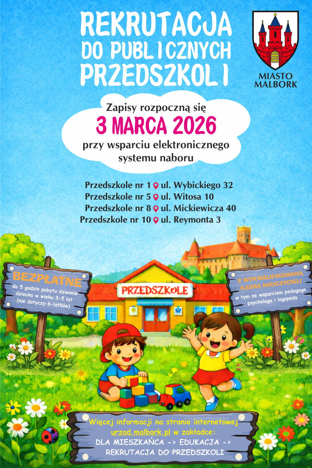 Rekrutacja do publicznych przedszkoli oraz oddziałów przedszkolnych w Malborku wystartuje 3 marca 2026 r. o godzinie 9.00 i będzie prowadzona przy wsparciu elektronicznego systemu naboru.