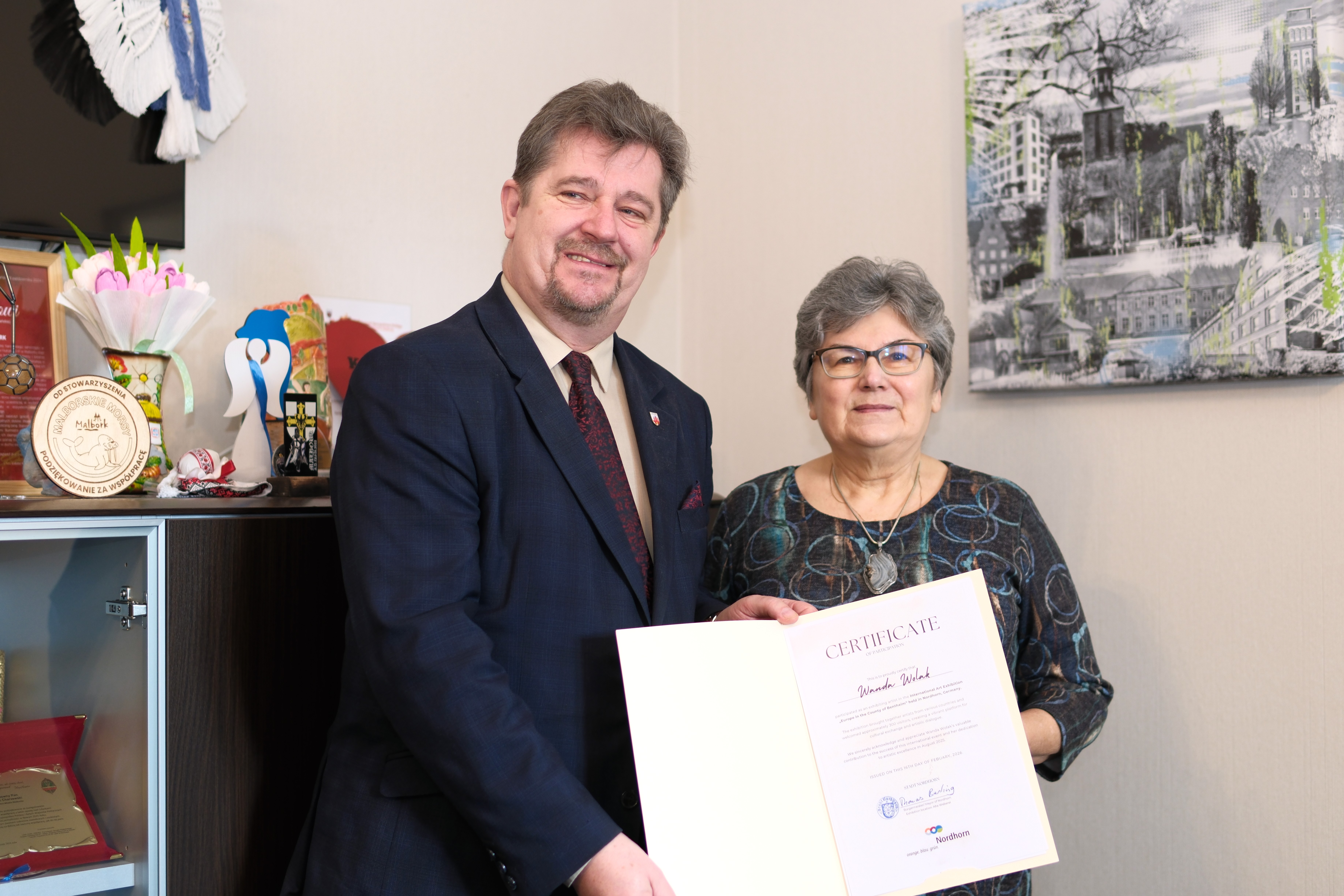 26 lutego burmistrz Malborka Marek Charzewski uroczyście wręczył malarce Wandzie Wolak certyfikat potwierdzający jej udział w międzynarodowej wystawie sztuki pod hasłem „Europa w regionie Grafschaft” zorganizowanej w niemieckim mieście partnerskim Nordhorn. Podczas spotkania burmistrz podziękował artystce za godne i pełne zaangażowania reprezentowanie Malborka na arenie międzynarodowej. Malarka przyszła do urzędu w towarzystwie męża, gratulacje złożyła również Katarzyna Fabiańska, odpowiedzialna za partnerską współpracę miast.