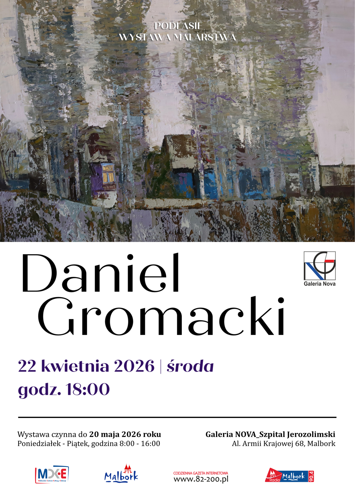 Malborskie Centrum Kultury i Edukacji w Malborku zaprasza na wernisaż wystawy malarstwa Daniela Gromackiego pt. „Podlasie”, który odbędzie się 22 kwietnia 2026 r. (środa) o godz. 18:00 w Galerii Nova w Szpitalu Jerozolimskim (al. Armii Krajowej 68 w Malborku).